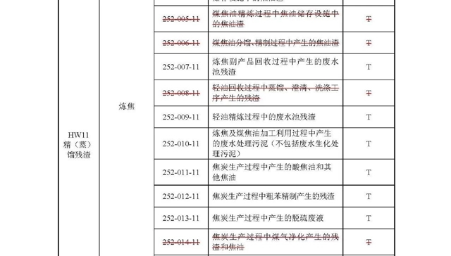 4.修改煤焦化相關(guān)危險(xiǎn)廢物的規(guī)定。針對(duì)該類廢物重點(diǎn)從兩個(gè)方面進(jìn)行修改:一是重新梳理并明確了煤焦化過(guò)程產(chǎn)生的各類危險(xiǎn)廢物及其工藝來(lái)源;二是根據(jù)不同煤焦油的利用途徑,在《危險(xiǎn)廢物豁免管理清單》中增加當(dāng)煤焦油用于生產(chǎn)煤基氫化油、碳素材料、炭黑時(shí),滿足一定條件利用過(guò)程可不按危險(xiǎn)廢物管理的規(guī)定。