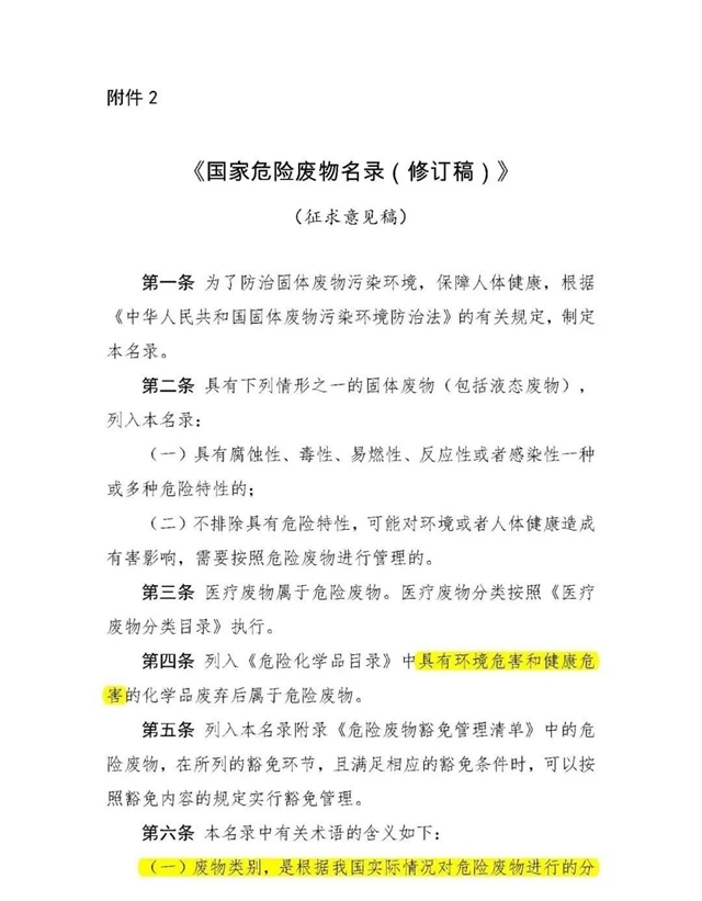 2019年9月5日,生態(tài)環(huán)境部發(fā)布關(guān)于征求《國(guó)家危險(xiǎn)廢物名錄(修訂稿)》(征求意見稿)意見的函;2019年12月30日,生態(tài)環(huán)境部發(fā)布關(guān)于公開征求《國(guó)家危險(xiǎn)廢物名錄(修訂稿)》(二次征求意見稿)意見的通知。