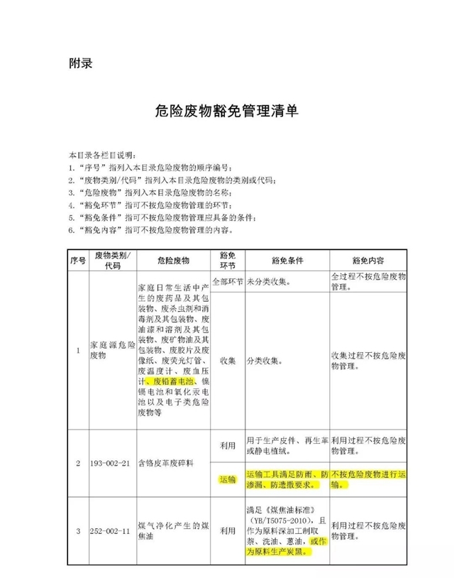 第四條 列入本名錄附錄《危險(xiǎn)廢物豁免管理清單》中的危險(xiǎn)廢物,在所列的豁免環(huán)節(jié),且滿足相應(yīng)的豁免條件時(shí),可以按照豁免內(nèi)容的規(guī)定實(shí)行豁免管理。