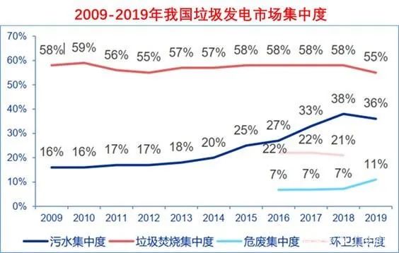 垃圾發(fā)電市場集中度基本在55-60%,當前頭部集中趨勢明顯:資金實力強、融資成本低、運營/成本控制能力強的企業(yè)逐漸擴大了市場影響力,做大做強;加上國家環(huán)保趨勢、補貼新政和市場下沉,使得龍頭企業(yè)競爭更加集中;