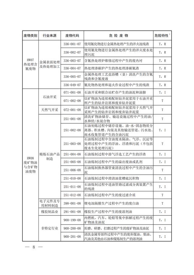 第八條 本名錄自 2021 年 1 月 1 日起施行。原環(huán)境保護(hù)部、國 家發(fā)展和改革委員會、公安部發(fā)布的《國家危險廢物名錄》(環(huán)境 保護(hù)部令第 39 號)同時廢止。