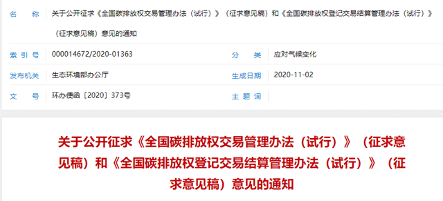 為貫徹落實黨中央、國務院關于建設全國碳市場的決策部署,我部組織起草了《全國碳排放權交易管理辦法(試行)》(征求意見稿)和《全國碳排放權登記交易結算管理辦法(試行)》(征求意見稿),于11月2日起征求有關單位意見并公開征求社會意見。