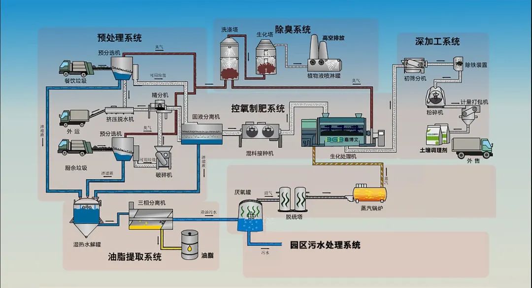 項(xiàng)目采用嘉博文公司好氧+厭氧發(fā)酵工藝和BGB-SCZ-7500型大設(shè)備處理系統(tǒng),主工藝為有機(jī)廢物生物強(qiáng)化腐殖化和控氧制肥系統(tǒng),充分利用餐廚廢棄物固相中的營(yíng)養(yǎng)成分,快速降解為生物腐植酸;輔助工藝采用高濃度有機(jī)液相厭氧發(fā)酵,產(chǎn)生沼氣可供給鍋爐燃燒回用于工藝用熱,實(shí)現(xiàn)沼氣的自身循環(huán)利用;沼液進(jìn)入污水處理,沼渣回進(jìn)控氧制肥系統(tǒng)。