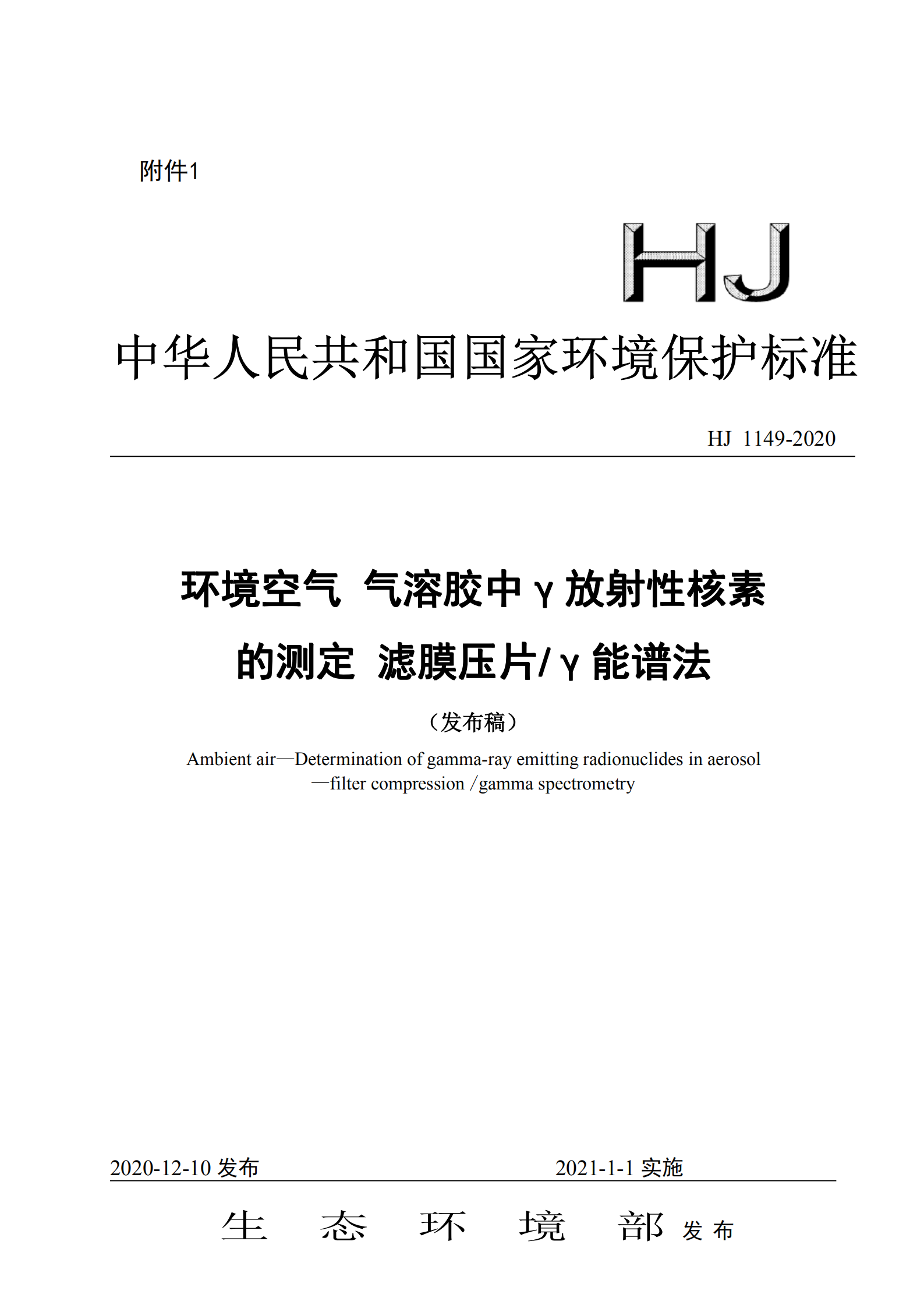 為貫徹《中華人民共和國環(huán)境保護法》和《中華人民共和國放射性污染防治法》,保護生態(tài)環(huán)境, 保障人體健康,規(guī)范環(huán)境空氣氣溶膠中γ放射性核素的測定方法,制定本標準。