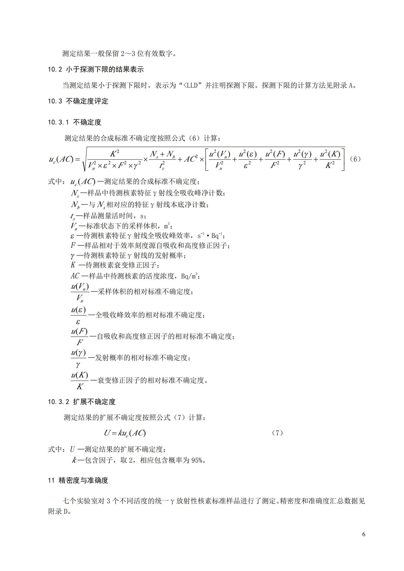 當采樣體積為 10000 m 3(標準狀態(tài)),測量時間為 24 小時時,本標準測定的各γ放射性核素探測 下限為 5μBq/m 3~100μBq/m 3,探測下限見附錄 A。