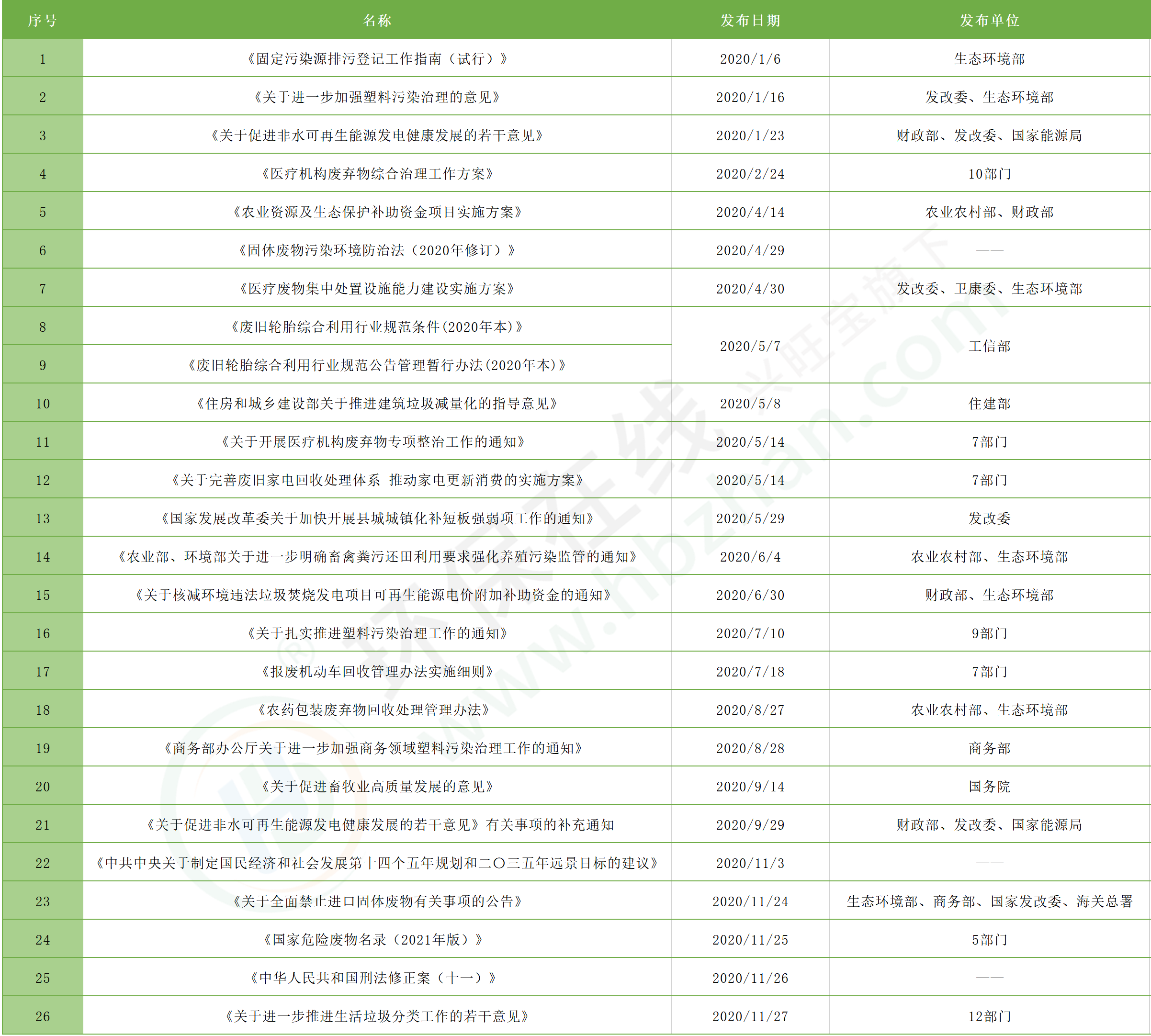 本文在2020年末尾展開年終匯總,將本年度重要的固廢相關(guān)政策法規(guī)整理如下: