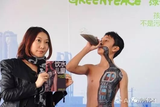 在上海第二屆廣告人藝術(shù)展上,由全球環(huán)保公益組織“綠色和平”等創(chuàng)意展示的行為藝術(shù)--“飲水兒童”讓現(xiàn)場觀眾頗具視覺的震撼,藝術(shù)家通過在模特兒童身上創(chuàng)意畫出宛如人體內(nèi)臟的一個“水污染處理器”圖案,以此警示,污染飲用水對人類所造成的無法彌補的傷害,引發(fā)社會對水污染問題的關(guān)注和重視。