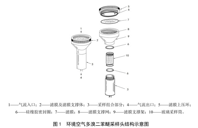 按HJ 194和HJ 691要求采樣,應(yīng)對(duì)采樣現(xiàn)場的氣溫、氣壓、風(fēng)速、風(fēng)向等氣象參數(shù)進(jìn)行測定,并對(duì)采樣過程中的技術(shù)參數(shù)進(jìn)行記錄。采樣前確認(rèn)石英/玻璃纖維濾膜(5.17)無破損后用鑷子輕輕夾住濾膜邊緣安裝在濾膜支撐網(wǎng)上,玻璃采樣筒安裝2塊 PUF(5.18),并安裝到采樣組合部分,按圖1依次安裝采樣頭,然后將采樣頭安裝在采樣器上并確保儀器穩(wěn)固。每次采樣前應(yīng)進(jìn)行采樣系統(tǒng)的氣密性和儀器運(yùn)行穩(wěn)定性等檢查,確保儀器符合要求后再進(jìn)行采樣。采樣結(jié)束后,關(guān)閉電源,卸下采樣頭,將采樣頭帶到干凈、無污染和避光的地方,取下濾膜,采樣塵面向里對(duì)折,取出玻璃采樣筒。兩者分別用鋁箔包好,放入保存盒中密封保存。采樣后的濾膜和PUF為環(huán)境空氣樣品。