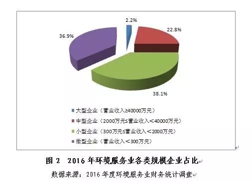 同時,因環(huán)境服務(wù)業(yè)發(fā)展態(tài)勢向好且門檻較低而受到社會資本追捧,一些在傳統(tǒng)行業(yè)嚴(yán)重虧損或被迫退出的企業(yè)轉(zhuǎn)而進(jìn)入環(huán)境服務(wù)領(lǐng)域。從統(tǒng)計結(jié)果看,2016年,大型企業(yè)(以營業(yè)收入劃分)超過百家,但占比較上年下降0.2%,小微企業(yè)占比較上年小幅上升1%,達(dá)到75%。環(huán)境服務(wù)業(yè)仍以小微型規(guī)模經(jīng)濟單位為主體,行業(yè)分散的狀況未見明顯改善。