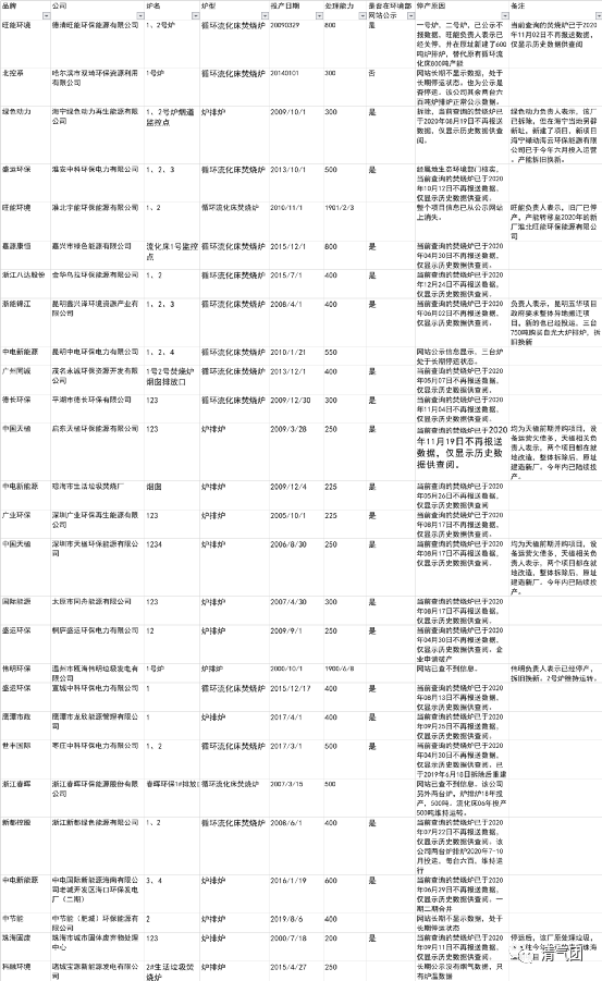 旗下的另一間企業(yè),淮北宇能環(huán)保能源有限公司(800噸處理量,兩臺循環(huán)流化床)已經整體停運,相關垃圾處理業(yè)務也轉由該公司在此地遷址重建的新廠——淮北旺能環(huán)保能源有限公司,并已于2020年正式投運,新廠處理量1500噸,兩臺750噸爐排爐。錦江環(huán)境:旗下昆明鑫興澤環(huán)境資源產業(yè)有限公司,共有三臺爐,處理量為1200噸,已于2020年06月02日不再報送數(shù)據(jù),并已在生態(tài)環(huán)境部生活垃圾焚燒發(fā)電廠自動監(jiān)測信息公示平臺,進行了主動公示。據(jù)悉,該項目屬于應政府要求整體異地搬遷、拆舊換新的項目,且新廠已經投運,新項目的焚燒爐為三臺750噸爐排爐。不過,研究團隊尚未在公示平臺查詢到相關信息,估計還是處于試運行狀態(tài),相關煙氣、爐溫、工況等數(shù)據(jù)尚未上網(wǎng)。中國天楹:旗下啟東和深圳項目,目前均整體停運,并已在生態(tài)環(huán)境部生活垃圾焚燒發(fā)電廠自動監(jiān)測信息公示平臺,進行了主動公示。據(jù)悉,兩個項目都是并購項目,前期設備和環(huán)保設施欠債較多,需要進行就地改造,整體拆除原有設備,原址新建焚燒爐臺套產線,基本算是原址建造新廠,且今年內都將陸續(xù)投產。不過,研究團隊尚未在公示平臺查詢到相關信息,估計還是處于試運行狀態(tài),相關煙氣、爐溫、工況等數(shù)據(jù)尚未上網(wǎng)。偉明環(huán)保:旗下溫州甌海項目,停運了一臺160噸的爐排爐,該爐于2000年投產,至今已運行20年。綠色動力:旗下海寧綠色動力再生能源有限公司(處理量六百噸,兩臺09年投運爐排爐)已經停運。同時,在海寧當?shù)亓肀傩轮?,新建了項目海寧綠動海云環(huán)保能源有限公司,已于今年六月投入運營,新項目處理量為1500噸,兩臺750噸爐排爐。相關信息已在生態(tài)環(huán)境部生活垃圾焚燒發(fā)電廠自動監(jiān)測信息公示平臺,進行了主動公示。