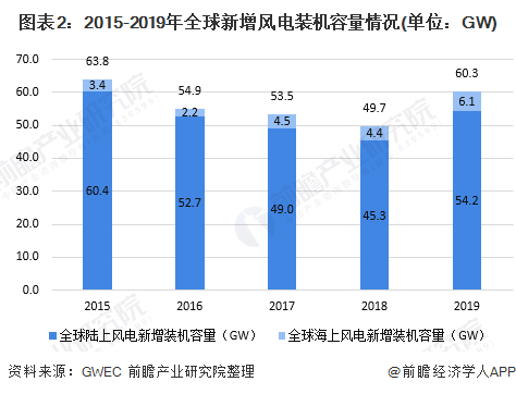 根據(jù)全球風(fēng)能理事會(GWEC)發(fā)布的《全球風(fēng)能報告2019》公布的數(shù)據(jù)顯示,2019年全球風(fēng)電新增裝機容量為60.4GW,同比增長19%,其中陸上新增風(fēng)電裝機容量54.3GW,海上新增風(fēng)電裝機容量6.1GW。