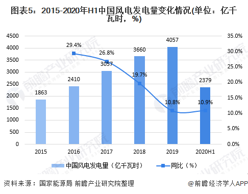 近年來,我國裝機容量的大幅度攀升帶動了發(fā)電量的高速增長。2019年,中國風(fēng)電發(fā)電大幅增長到4057億千瓦時,同比增長10.85%;2020年上半年,全國風(fēng)電發(fā)電量為2379億千瓦時,同比增長10.9%。