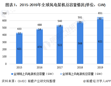 近年來,風(fēng)力發(fā)電作為清潔能源備受全球各國關(guān)注,全球風(fēng)力發(fā)電規(guī)模穩(wěn)步增長,根據(jù)全球風(fēng)能理事會(GWEC)發(fā)布的《全球風(fēng)能報告2019》公布的數(shù)據(jù)顯示,2019年全球風(fēng)電裝機總?cè)萘繛?51GW,同比增長12%,其中陸上風(fēng)電裝機容量621GW,海上風(fēng)電裝機容量30GW??傮w來說,目前全球風(fēng)力發(fā)電以陸上風(fēng)力發(fā)電為主。