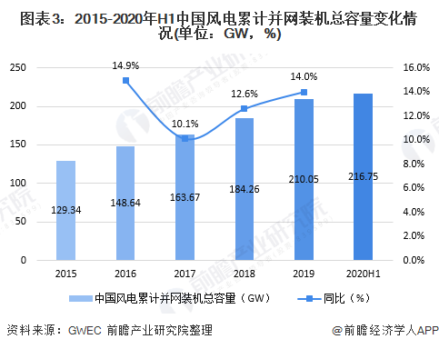 我國風(fēng)電產(chǎn)業(yè)在近幾年得到快速發(fā)展,風(fēng)電裝機容量快速增長,2019年,我國風(fēng)電裝機容量達到了210.05GW,同比增長14%,截至2020年上半年,我國我國風(fēng)電裝機容量達到了216.75GW。