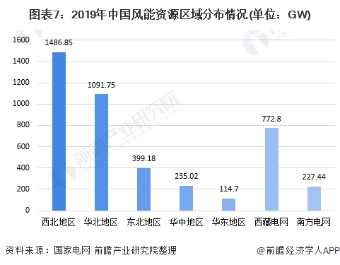 由于受地域和氣候的影響,我國風(fēng)能資源在地理分布上差異較大,風(fēng)能資源較多分布在西北、華北和東北地區(qū),2019年我國西北地區(qū)風(fēng)電總儲量達1486.85GW,是風(fēng)電資源儲量最大的地區(qū)。