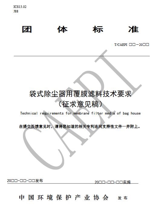 關(guān)于征求中國(guó)環(huán)境保護(hù)產(chǎn)業(yè)協(xié)會(huì)標(biāo)準(zhǔn)《袋式除塵器用覆膜濾料》意見(jiàn)的函