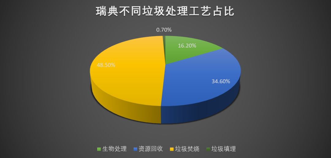 瑞典每年處理的生活垃圾大約在 466 萬(wàn)噸,全國(guó)人均垃圾年產(chǎn)生量為 467 千克。在瑞典,幾乎所有的生活垃圾都被回收、加工和處理,或是作為能源使用。在瑞典的生活垃圾中,循環(huán)利用為 161.5 萬(wàn)噸,占總量的 34.6% ;將有機(jī)垃圾變?yōu)槎逊?、沼氣或混合肥料的生物處理量?75.7 萬(wàn)噸,占總量的 16.2% ;將垃圾轉(zhuǎn)化為熱能和電能的焚燒處理量為 226.3 萬(wàn)噸,占總量的 48.5% ;沒(méi)有利用價(jià)值被填埋處理的為 3.1 萬(wàn)噸,僅占總量的 0.7%。