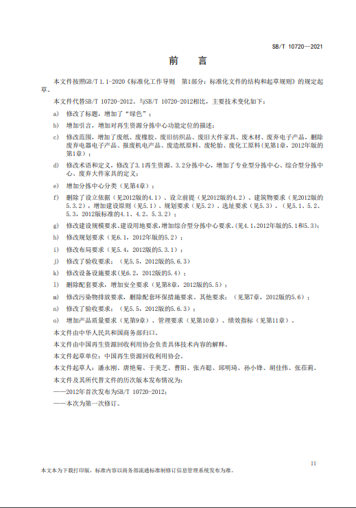 2017年,商務(wù)部辦公廳下達(dá)《2017年流通行業(yè)標(biāo)準(zhǔn)項(xiàng)目計(jì)劃》(商辦流通函〔2017〕232號(hào)),對(duì)《再生資源分揀中心建設(shè)管理規(guī)范》(SB/T 10720-2012)進(jìn)行修訂。本次修訂的目的是增加對(duì)生活垃圾分類后再生資源的處置功能,進(jìn)一步嚴(yán)格建設(shè)和加工過程中的安全、環(huán)保、質(zhì)量管理規(guī)范,提升分揀中心對(duì)城市綜合環(huán)境治理的服務(wù)能力。