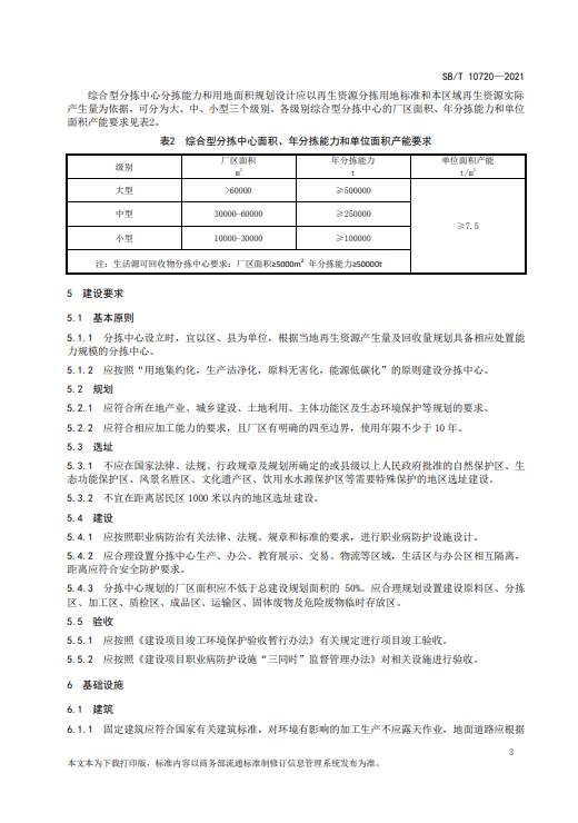修訂后的標(biāo)準(zhǔn)更加關(guān)注規(guī)劃設(shè)計(jì)的科學(xué)性和適用性。新標(biāo)準(zhǔn)在規(guī)劃設(shè)計(jì)中提出了宜以區(qū)、縣為單位,根據(jù)當(dāng)?shù)卦偕Y源產(chǎn)生量及回收量規(guī)劃具備相應(yīng)處置能力規(guī)模的分揀中心,這一要求與當(dāng)前以區(qū)縣為單位建立健全生活垃圾分類處理設(shè)施的相關(guān)工作要求相一致。 修訂后的標(biāo)準(zhǔn)核心和亮點(diǎn)之一是對(duì)專業(yè)型和綜合型分揀中心分別提出了廠區(qū)面積、分揀加工能力和單位面積產(chǎn)能的量化指標(biāo)。這一系列指標(biāo)是在全面調(diào)研和科學(xué)計(jì)算基礎(chǔ)上,平衡了南北差異和城市類別,提出了適用性和科學(xué)性指標(biāo)。尤其是單位面積產(chǎn)能指標(biāo)的提出,為行業(yè)內(nèi)首次,對(duì)各級(jí)政府開展分揀中心的規(guī)劃和設(shè)計(jì)工作具有重要指導(dǎo)意義。附件:《再生資源綠色分 揀中心建設(shè)管理規(guī)范》(SB/T10720-2021)