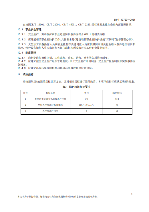 修訂后的標(biāo)準(zhǔn)更加關(guān)注分揀中心的環(huán)保要求,對(duì)分揀中心的廢水處理、降噪、廢氣排放、防塵、危險(xiǎn)廢物和一般工業(yè)固廢的管理進(jìn)行了分別規(guī)范。尤其是績(jī)效指標(biāo)的提出,以可量化的手段對(duì)再生資源綠色分揀中心的分揀加工能力和節(jié)能降耗水平給與評(píng)價(jià)。同時(shí)也更加注重質(zhì)量管理、安全管理和職業(yè)健康管理,新增了職工安全生產(chǎn)培訓(xùn)制度、職業(yè)病防治制度、安全生產(chǎn)檢查制度和突發(fā)事件應(yīng)急預(yù)案管理等要求。