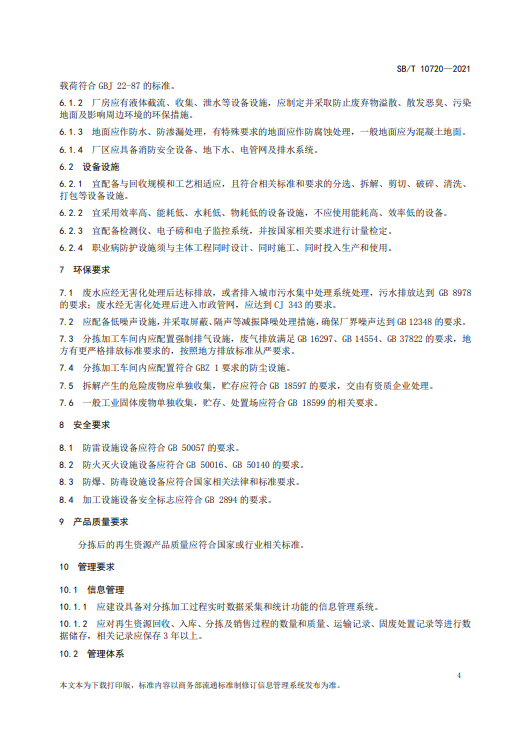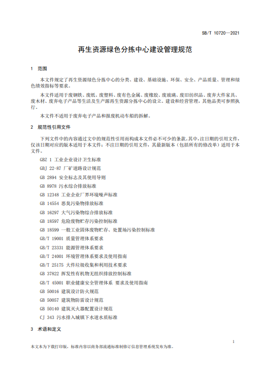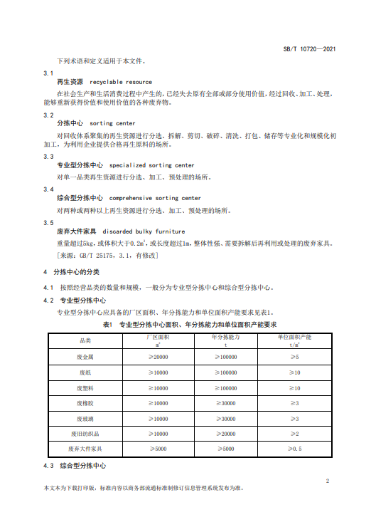 新修訂的《再生資源分揀中心建設(shè)管理規(guī)范》經(jīng)商務(wù)部公告,將于2021年5月1日實(shí)施。修訂后的標(biāo)準(zhǔn)適用范圍更為明確,增加了引言、廢棄大件家具的術(shù)語、分揀中心的分類、基本要求、部分環(huán)保要求、部分安全要求、產(chǎn)品質(zhì)量要求、管理要求和績(jī)效指標(biāo)等內(nèi)容。