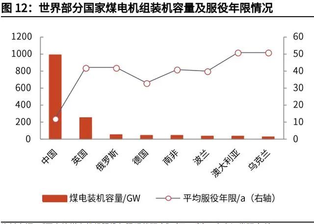 煤電資產(chǎn)擱淺的問(wèn)題,表明了轉(zhuǎn)型需經(jīng)歷陣痛。一方面,從能源結(jié)構(gòu)和自身稟賦 來(lái)看,我國(guó)的能源消耗以煤為主,煤電發(fā)電量在 2019 年占總發(fā)電量的 65%,遠(yuǎn) 超發(fā)達(dá)國(guó)家;另一方面,我國(guó)煤電機(jī)組的平均服役年限僅 12 年,而發(fā)達(dá)國(guó)家普 遍達(dá)到 40 年以上。更快的碳排放量下降斜率,意味著將會(huì)有大量的未達(dá)到退役 年限的煤電資產(chǎn)提前“擱淺”。