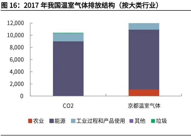 除了能源使用(主要是化石燃料燃燒及電力/熱力使用),工業(yè)過(guò)程碳排放也是 重要的二氧化碳來(lái)源,2017 年占比 13%。工業(yè)過(guò)程碳排放與各個(gè)行業(yè)采用的生產(chǎn)工藝直接相關(guān)。