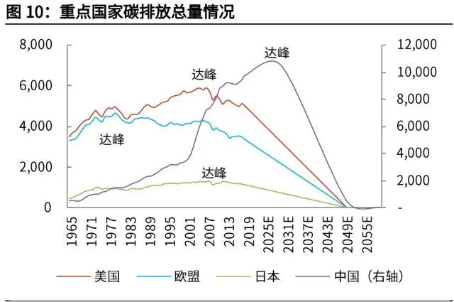 我國(guó)碳排放下降斜率更大。由于發(fā)展階段的不同,發(fā)達(dá)國(guó)家已普遍經(jīng)歷“碳達(dá)峰”, 為達(dá)到 2050 年“碳中和”,更大程度上只是延續(xù)以往的減排斜率。而我國(guó)碳排 放總量仍在增加,需要經(jīng)歷 2030 年前“碳達(dá)峰”,然后走向 2060 年前“碳中 和”。從實(shí)現(xiàn)“碳中和”的年限來(lái)看,比發(fā)達(dá)國(guó)家時(shí)間更緊迫,碳排放下降的斜 率更大。