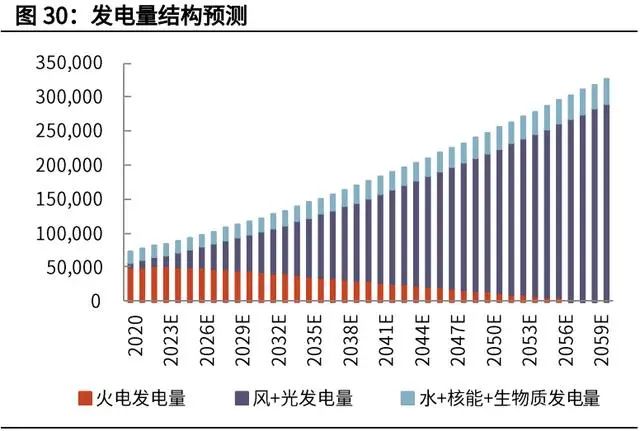 根據(jù)我們的上述假設(shè),以 2019 年發(fā)電量 7.22 萬(wàn)億千瓦時(shí)為基礎(chǔ),2030 年發(fā)電 量達(dá)到 11.9 萬(wàn)億千瓦時(shí)(和部分機(jī)構(gòu)的預(yù)測(cè)數(shù)據(jù)基本一致),2060 年發(fā)電量進(jìn)一步達(dá)到 32.71 萬(wàn)億千瓦時(shí)。