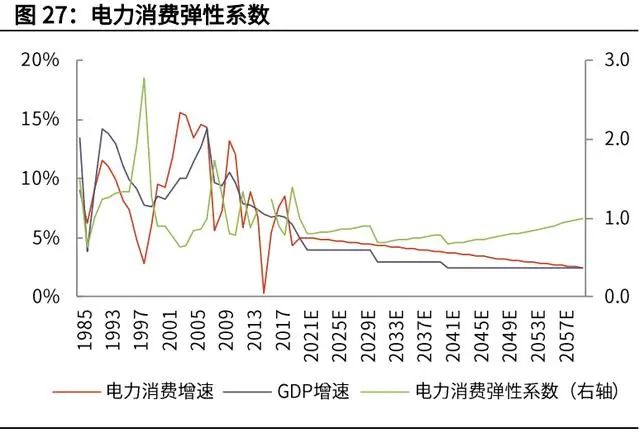 (1)我們采用“自上而下”的測(cè)算方法,假設(shè)未來(lái) GDP 增速和發(fā)電量增速?gòu)摹笆?三五”末期的 5%逐步下降到 2.5%;而由于節(jié)能降耗的原因,未來(lái)單位 GDP 能 耗逐步下降,電力消費(fèi)彈性系數(shù)將小于 1。