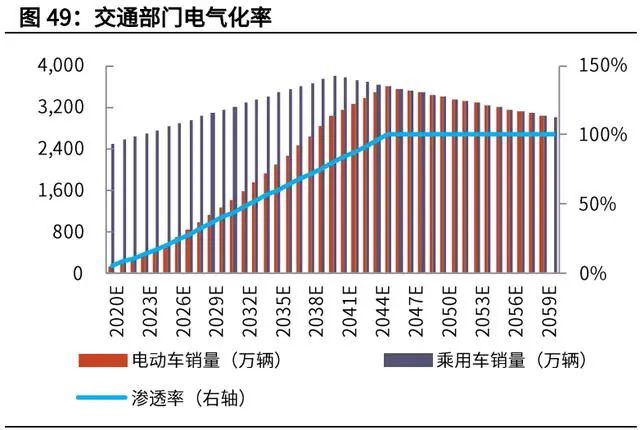 我們預(yù)計(jì),乘用車銷量在 2040 年見(jiàn)頂,電動(dòng)車的滲透率在 2045 年達(dá)到 100%, 則電動(dòng)車的銷量將在 2045 年達(dá)到 3600 萬(wàn)輛/年。假設(shè)單車售價(jià)保持下行趨勢(shì), 在 2060 年達(dá)到 12 萬(wàn)元/輛左右。則電動(dòng)車領(lǐng)域累計(jì)將帶來(lái) 130 萬(wàn)億人民幣的累 計(jì)新增投資。