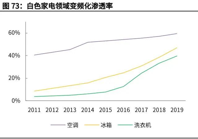 根據(jù)產(chǎn)業(yè)在線統(tǒng)計(jì),2013 年變頻空調(diào)標(biāo)準(zhǔn)頒布實(shí)施,空調(diào)的變頻占有率提升超 過(guò)了 6 個(gè)百分點(diǎn);2016 年 10 月份冰箱新標(biāo)準(zhǔn)實(shí)施,2017 年冰箱的變頻化率迅 速提高了 10%;洗衣機(jī)新標(biāo)準(zhǔn)在 2018 年 10 月推出,2019 年變頻洗衣機(jī)的市 占率較推出前大幅增加了 8 個(gè)百分點(diǎn)。
