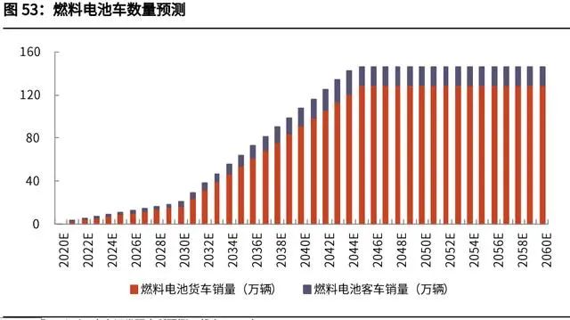 氫能燃料電池將主要用于重型道路交通(客車、貨車)。假設(shè)輕型、中型、大型 貨車的年銷量保持在 150、20、70 萬(wàn)輛,燃料電池滲透率在 2045 年達(dá)到 40%、 60%、80%,而后保持該滲透率;輕型、中型、大型客車的年銷量保持 30、7、 7 萬(wàn)輛,燃料電池滲透率在 2045 年達(dá)到 30%、50%、70%,而后保持該滲透率, 則累計(jì)新增投資達(dá)到 29 萬(wàn)億元人民幣。