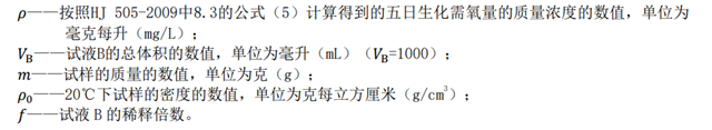 試樣中五日生化需氧量(BOD5)以質(zhì)量濃度ρ2計(jì),單位以毫克每升(mg/L)表示,按式(2)計(jì)算: