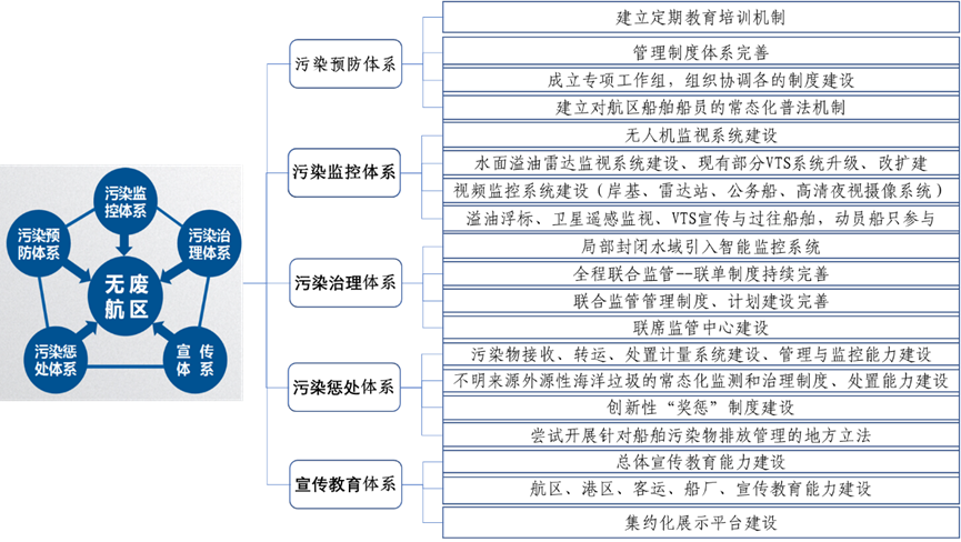 針對船舶污染物產(chǎn)生量大、監(jiān)管難、海陸處置體系銜接不暢的問題,威海市堅持目標(biāo)導(dǎo)向和問題導(dǎo)向,聚焦主要矛盾,精準靶向破題攻堅,建設(shè)性地提出在成山頭水域探索建設(shè)“無廢航區(qū)”,總結(jié)提煉出“無廢航區(qū)3456”建設(shè)模式。三個階段性目標(biāo)和船舶固廢三大管控流程。三個階段性目標(biāo)即到2020年底,在成山頭“兩制”水域內(nèi)探索構(gòu)建船舶“防-控-治-懲-宣”五環(huán)管理體系,“無廢航區(qū)”模式初步建立。到2025年底,將“無廢航區(qū)”模式擴展到石島東南、成山頭西北部兩個水域,綠色航區(qū)發(fā)展成效顯著。到2035年底,在威海市管轄海域全面建成“無廢航區(qū)”,船舶產(chǎn)生的各類廢物全面實現(xiàn)精細化管理和無害化處置。船舶固廢三大管控流程即實現(xiàn)船舶固廢源頭減量和控制、實現(xiàn)船舶固廢遷移過程控制、實現(xiàn)海陸界面和海上治理處置。 “四零四全”工作目標(biāo)體系。即航區(qū)內(nèi)實現(xiàn)船舶生活垃圾‘零’排放、船舶壓載水和沉積物‘零’置換、船舶油污水(殘油、油渣)‘零’排放、船舶有毒有害物質(zhì)‘零’排放”,船員教育全覆蓋、船舶監(jiān)控全覆蓋、航區(qū)巡航全覆蓋、污染處置全覆蓋。“防-控-治-懲-宣”五環(huán)管理體系。即建立船舶污染預(yù)防體系。按照國際海事組織(IMO)關(guān)于船舶污染防治各項要求,開展《國際防止船舶造成污染公約》《國際控制船舶有害防污底系統(tǒng)公約》《國際油污防備反應(yīng)和合作公約》等公約和我國法律法規(guī)實施宣貫,制定并實施《威海市船舶污染物接收、轉(zhuǎn)運和處置聯(lián)單制度(試行)》,完善船舶污染物管理機制,構(gòu)建船舶污染預(yù)防體系。建立船舶污染監(jiān)控體系,通過衛(wèi)星遙感、無人機空中監(jiān)控、船舶交通管理系統(tǒng)(VTS)、船舶自動識別系統(tǒng)(AIS)、視頻監(jiān)控系統(tǒng)、海巡船巡航執(zhí)法等建立航區(qū)內(nèi)船舶污染陸??仗煲惑w化立體監(jiān)視監(jiān)控體系。建立船舶污染治理體系,全面開展船舶“碧海藍天”行動,加強船舶污染防治聯(lián)合監(jiān)管力度;地方政府投資建設(shè)了兩個海上污染處置設(shè)備庫,海事、海洋、環(huán)保、住建、應(yīng)急等部門聯(lián)合開展海上污染處理和處置,打造船舶污染綜合治理體系。建立船舶外源性污染懲處體系,開展到港船舶非法排污倒查、在航船舶非法排污全國協(xié)查等,對航區(qū)內(nèi)船舶違法行為,采取行政處罰、船舶滯留、船員記分等行政強制手段,實施從嚴懲處。建立“無廢航區(qū)”宣傳體系,開展“無廢航區(qū)”環(huán)保宣傳進校園、進企業(yè)活動;通過甚高頻通信系統(tǒng)、海岸電臺等對航區(qū)內(nèi)船員進行環(huán)保宣傳;開展成山頭航海博物館“無廢航區(qū)”展覽區(qū)建設(shè),拓展海洋環(huán)保宣傳新途徑。圖 9 “無廢航區(qū)”五環(huán)管理體系圖 10 “無廢航區(qū)”海陸空天一體化污染監(jiān)控體系示意圖