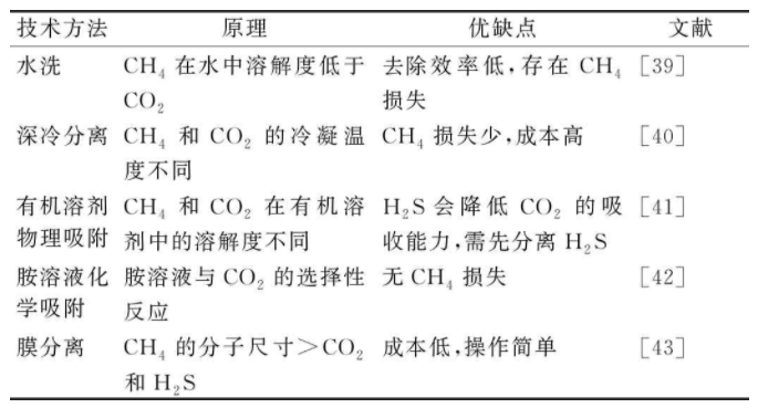 廚余垃圾厭氧消化的產(chǎn)物沼氣成分復(fù)雜,包括CH4、CO2、N2、H2S和硅氧烷等。其中:1)CO2含量越高,沼氣中的熱值越低;2)除甲烷外,沼氣中其他氣體是沼氣污染物。H2S和NH3具有極強(qiáng)的腐蝕性,燃燒后產(chǎn)生的SO2會(huì)破壞熱電聯(lián)產(chǎn)裝置和金屬部件。而硅氧烷,即使?jié)舛群苄?,但燃燒后產(chǎn)生的硅膠類氧化物能殘留沉積在燃燒設(shè)備的引擎和閥門上造成故障。這些原因都會(huì)導(dǎo)致厭氧消化產(chǎn)生的沼氣不能直接利用,因此需要通過(guò)物理化學(xué)技術(shù)、生物技術(shù)等對(duì)產(chǎn)生的沼氣進(jìn)行凈化和升級(jí),以提高熱值,將其轉(zhuǎn)化為更高標(biāo)準(zhǔn)的燃料能源。常規(guī)的沼氣凈化升級(jí)方法總結(jié)見(jiàn)表2。