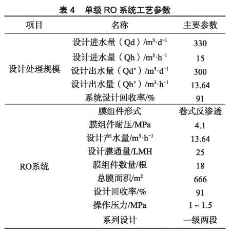 單級(jí)RO主要是針對兩級(jí)DTRO系統(tǒng)出水氨氮值超過限值而采取的保安措施,單級(jí)RO系統(tǒng)的主要工藝參數(shù),見表4。