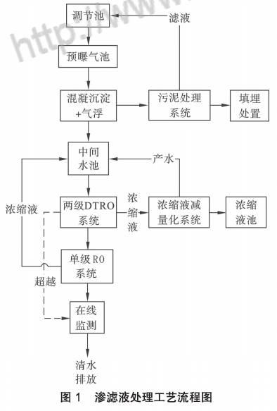 中間水池內(nèi)滲濾液由泵提升進(jìn)入兩級(jí)DTRO系統(tǒng)處理,兩級(jí)DTRO系統(tǒng)前設(shè)置了一套50um的 砂濾系統(tǒng)和一套10um的芯濾系統(tǒng),經(jīng)過兩級(jí)DTRO處理之后,產(chǎn)水經(jīng)過在線監(jiān)測系統(tǒng)達(dá)標(biāo)排放,兩級(jí)DTRO濃縮液進(jìn)入濃縮液減量化系統(tǒng)做減量處理, 濃縮液減量化系統(tǒng)的產(chǎn)水進(jìn)入中間水池,再次進(jìn)入兩級(jí)DTRO系統(tǒng)處理,濃縮液減量化系統(tǒng)的濃縮液排放到濃縮液池暫存。