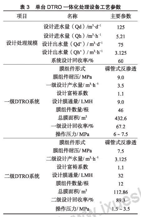 兩級(jí)DTRO系統(tǒng)包含了 4臺(tái)兩級(jí)DTRO 一體化處理設(shè)備,每臺(tái)設(shè)備的主要工藝參數(shù)見表3。