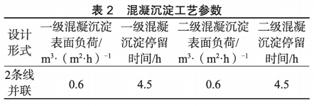 預(yù)處理包含了曝氣改性、兩級(jí)混凝沉淀和混凝氣浮,混凝沉淀的主要工藝參數(shù),見表2。