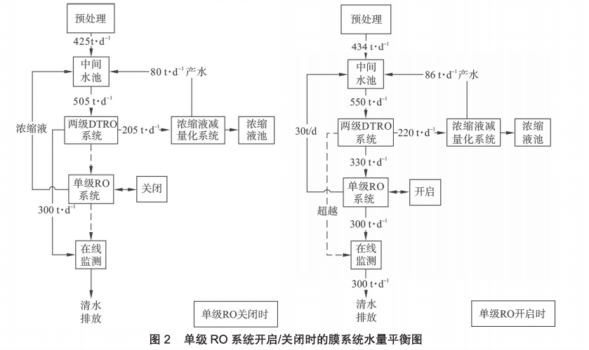 視兩級(jí)DTRO系統(tǒng)出水氨氮是否超標(biāo),選擇是否開啟單級(jí)RO系統(tǒng)。當(dāng)兩級(jí)DTRO系統(tǒng)出水氨氮靖,關(guān)閉RO系統(tǒng)此時(shí)系竝體回收率為70.59%;當(dāng)兩級(jí)DTRO出水氨氮值超標(biāo),開啟RO系統(tǒng),此 時(shí)系統(tǒng)整體回收率為69.12%。量平衡見圖2。