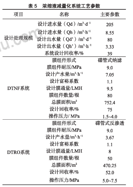 濃縮液減量化系統(tǒng)包含單級(jí)DTNF和單級(jí)DTRO,用于處理兩級(jí)DTRO系統(tǒng)產(chǎn)生的濃縮液, 將兩級(jí)DTRO濃縮液再次濃縮,該套系統(tǒng)內(nèi)的DTRO采用相對低截留率、高通量的RO膜。濃縮 液減量化系統(tǒng)設(shè)備的產(chǎn)水再進(jìn)入兩級(jí)DTRO設(shè)備中再次處理,能夠?qū)崿F(xiàn)濃縮液的減量,濃縮液減量 化系統(tǒng)的工藝參數(shù)見表5。