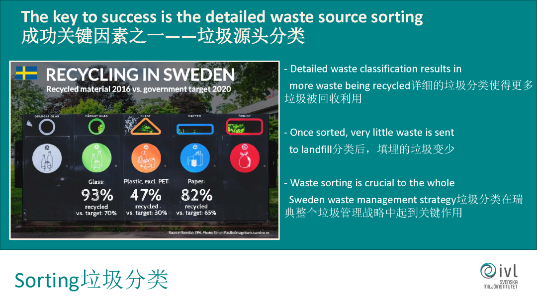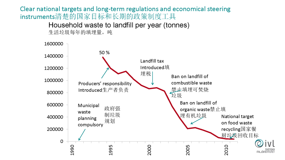 瑞典為什么能那么快實(shí)現(xiàn)垃圾填埋率的降低,在90年的時(shí)候它的垃圾填埋率也很高,后來(lái)出臺(tái)了一系列的政策。比如他規(guī)定各個(gè)地方政府必須強(qiáng)制有垃圾的管理和規(guī)劃,他也是在全球提出生產(chǎn)者責(zé)任延伸制度的一個(gè)國(guó)家,在這方面提升了很大的垃圾回收率,進(jìn)一步減少了垃圾的填埋率。后續(xù)提出了垃圾填埋稅,它的填埋稅是非常高的,一噸大概有一千塊錢左右的填埋稅。再往后提出了更加嚴(yán)苛的要求,比如對(duì)可以焚燒的垃圾,還有有機(jī)的垃圾,現(xiàn)在都是完全禁止去填埋的。再往后,對(duì)整個(gè)國(guó)家餐廚垃圾的回收制定了目標(biāo),比如我們?cè)谒沟赂鐮柲υ?020年必須達(dá)到50%的餐廚垃圾的回收利用,不能去填,也不能去燒。