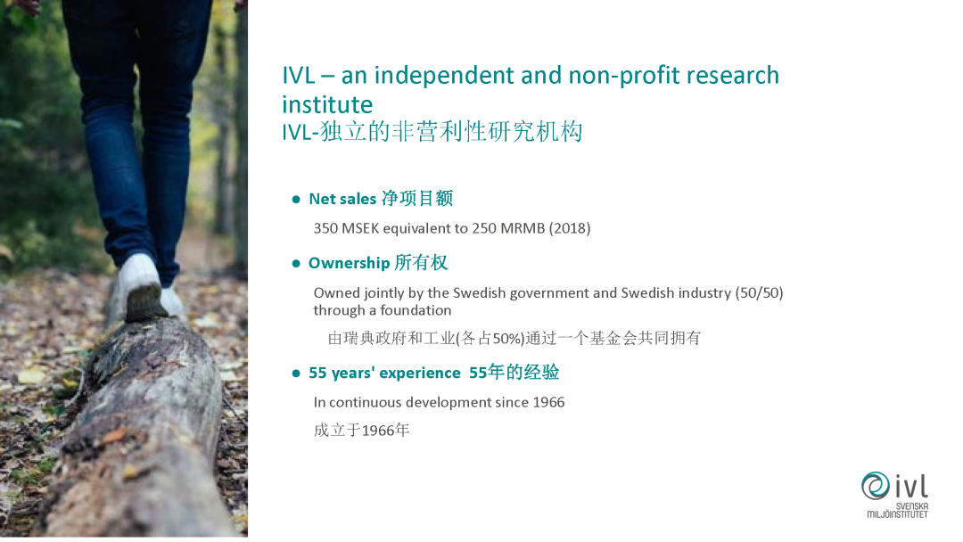 先簡(jiǎn)單介紹一下我們的機(jī)構(gòu),我們的機(jī)構(gòu)是由瑞典的政府和工業(yè)各占50%成立的一個(gè)非盈利性的應(yīng)用性的研究機(jī)構(gòu),成立于1966年,到目前有五十多年的歷史。我們的總部是在瑞典的首都斯德哥爾摩,在其他的國(guó)家,在中國(guó)和印度都有代表處,目前我們有350名的員工。包括環(huán)境工程師、經(jīng)濟(jì)學(xué)家、社會(huì)學(xué)家等等各方面一些跨學(xué)科的專家,在瑞典我們有自己的實(shí)驗(yàn)室,除了科研以外也做一些技術(shù)開(kāi)發(fā)、技術(shù)轉(zhuǎn)移等工作。