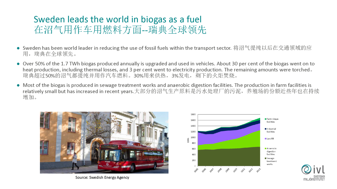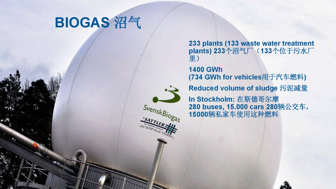 另外一個(gè)特色,瑞典的沼氣生產(chǎn)出來(lái),不是像我們傳統(tǒng)中國(guó)所提的是農(nóng)業(yè)沼氣,它是工業(yè)化的,是完全經(jīng)過(guò)提純和壓縮,用到它的公交車?yán)锘蛘攮h(huán)衛(wèi)的車輛里,是這樣循環(huán)使用的。它的沼氣提純用在交通領(lǐng)域的應(yīng)用在全球也是最領(lǐng)先的,超過(guò)一半的沼氣都是用在汽車燃料里。比如左側(cè)的大公交車,隨處可見(jiàn)的大公交車,上面有一個(gè)小頂子,這里面裝的就是沼氣,壓縮和提純以后的沼氣。