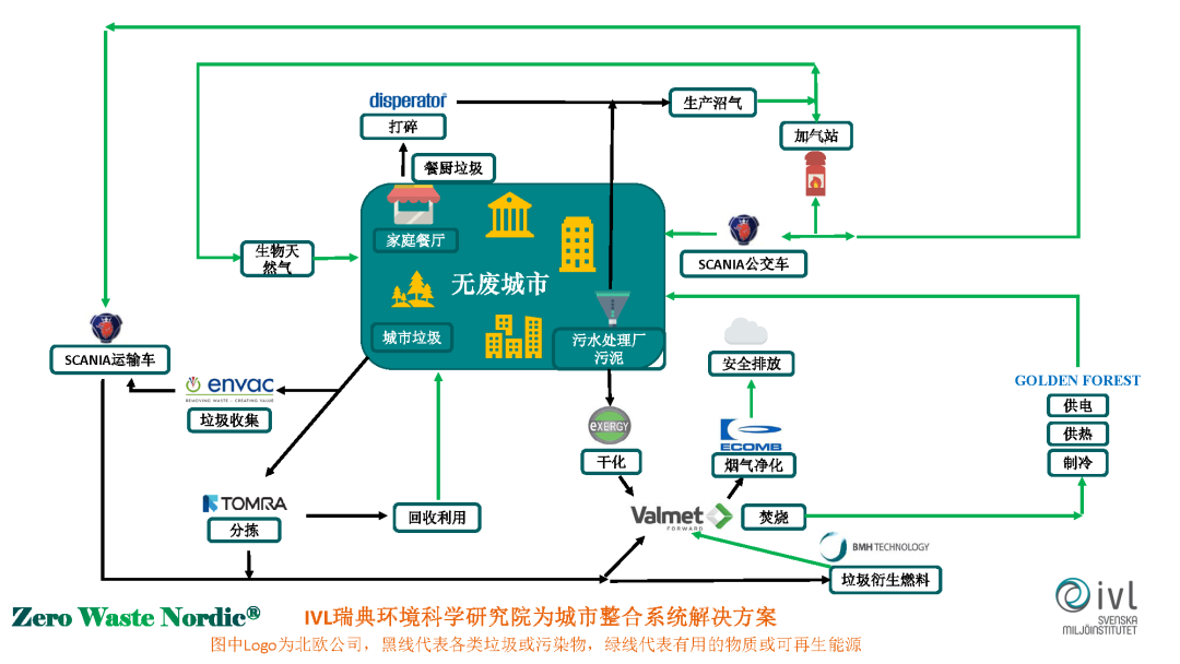 這是我們初步的聯(lián)盟的解決方案,目前我們所含的無(wú)廢城市的解決方案包括餐廳的餐廚垃圾,餐廚垃圾我們有一間公司可以做很智能化的破碎和收集,收集起來(lái)不是像過(guò)去國(guó)內(nèi)在提的有爭(zhēng)議的,進(jìn)入到下水道,我們彌補(bǔ)的經(jīng)過(guò)一個(gè)容器把它收集起來(lái),把它做沼氣。沼氣提純以后,可以用到這家公司的公交車?yán)?,也是很知名的一家北歐的供應(yīng)商。提純以后,可以作為可再生的天然氣回到城市里進(jìn)行回收和使用。同時(shí)可以用在環(huán)衛(wèi)的垃圾運(yùn)輸車?yán)?,開(kāi)始常老師講到環(huán)衛(wèi)車怎么更加清潔,這也是一個(gè)比較好的做法。普通的生活垃圾,這里面有一家瑞典公司是做智能化收集的,是把垃圾像收污水一樣收垃圾,垃圾不是投到垃圾桶,而是直接掉到地下的管廊里,它有高速的風(fēng),可以快速的把它運(yùn)輸?shù)嚼修D(zhuǎn)站,在地上看不到垃圾和垃圾桶?;厥找院?,這家公司可以做一個(gè)很智能化的分揀,它是全球很知名的一家做自動(dòng)化分選的公司??梢园押苡袃r(jià)值的東西回收回來(lái),沒(méi)有價(jià)值的東西進(jìn)一步去做能源回收。能源回收這一塊,這里有一家芬蘭公司是做垃圾焚燒做得比較好的,叫韋美德(音),焚燒以后,它的煙氣做到凈化,有一家公司是做煙氣凈化的。焚燒所產(chǎn)生的熱量由這家公司去設(shè)計(jì),給城市供熱供冷、供電。還有一家芬蘭公司做垃圾衍生原料,垃圾處理以后,讓垃圾焚燒會(huì)更加便利。
