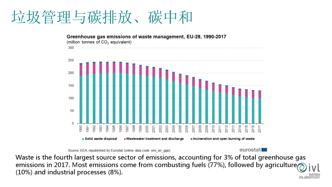 回到垃圾管理和碳排放、碳中和這個(gè)主題,我這邊做了一些調(diào)研,這是歐盟的一個(gè)數(shù)據(jù),它統(tǒng)計(jì)了在廢物處理行業(yè)內(nèi)它的溫室氣體排放。根據(jù)這個(gè)統(tǒng)計(jì),我們發(fā)現(xiàn)我們廢物處理這個(gè)行業(yè)是整個(gè)社會(huì)第四大的溫室氣體排放,雖然它的比例不高,只有3%,但是它的排名是比較靠前的。別看我們這個(gè)行業(yè)不是很大,但是我們對(duì)碳排放和碳中和的貢獻(xiàn)也是不可小看的。