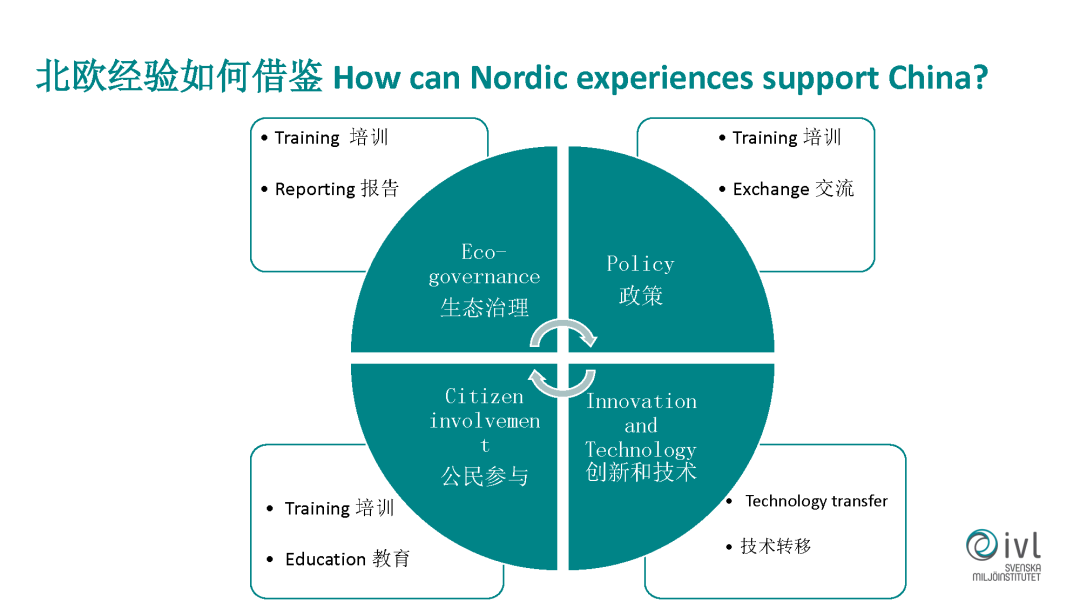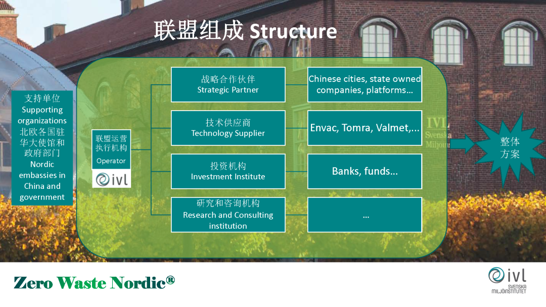 第一個(gè)就是在生態(tài)管理,生態(tài)治理方面,第二個(gè)就是通過(guò)政策的借鑒,第三個(gè)就是公民老百姓的參與,第四個(gè)就是創(chuàng)新和技術(shù)。在技術(shù)方面我們現(xiàn)在有這樣一些探索。我們成立了北歐無(wú)廢城市技術(shù)和投資聯(lián)盟這樣一個(gè)機(jī)構(gòu),這個(gè)機(jī)構(gòu)是由我們?nèi)鸬洵h(huán)科院成立的和運(yùn)營(yíng)的。我們邀請(qǐng)四位合作伙伴加入到我們這個(gè)聯(lián)盟,形成一個(gè)類似于航空母艦的整體解決方案,想為中國(guó)市場(chǎng)做一些服務(wù)。