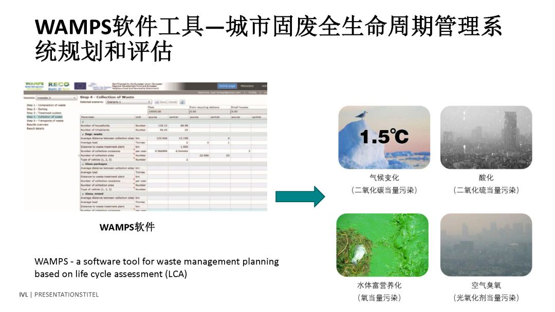 為什么說(shuō)我們?cè)谇懊嬗幸粋€(gè)五階梯的概念,我們想讓垃圾管理盡量避免產(chǎn)生,這樣的話,對(duì)碳排放和碳中和是更加有效的。這個(gè)計(jì)算是很復(fù)雜的,是基于我們自己的軟件工具。對(duì)城市的垃圾管理有一個(gè)全生命周期的管理和系統(tǒng),可以從垃圾成分分析到垃圾收集、轉(zhuǎn)運(yùn)、分類到終端的處理,整個(gè)全生命周期我們要算一下它的環(huán)境影響,我們算的一個(gè)是二氧化碳它的排放,另外包括酸雨酸化的影響,包括對(duì)水體富營(yíng)養(yǎng)化的影響,包括對(duì)空氣臭氧的影響,我們用工具算一下,通過(guò)這樣的計(jì)算方法可以比較出來(lái)哪一種垃圾管理的方法對(duì)城市來(lái)說(shuō)它的全生命周期的環(huán)境影響最小。