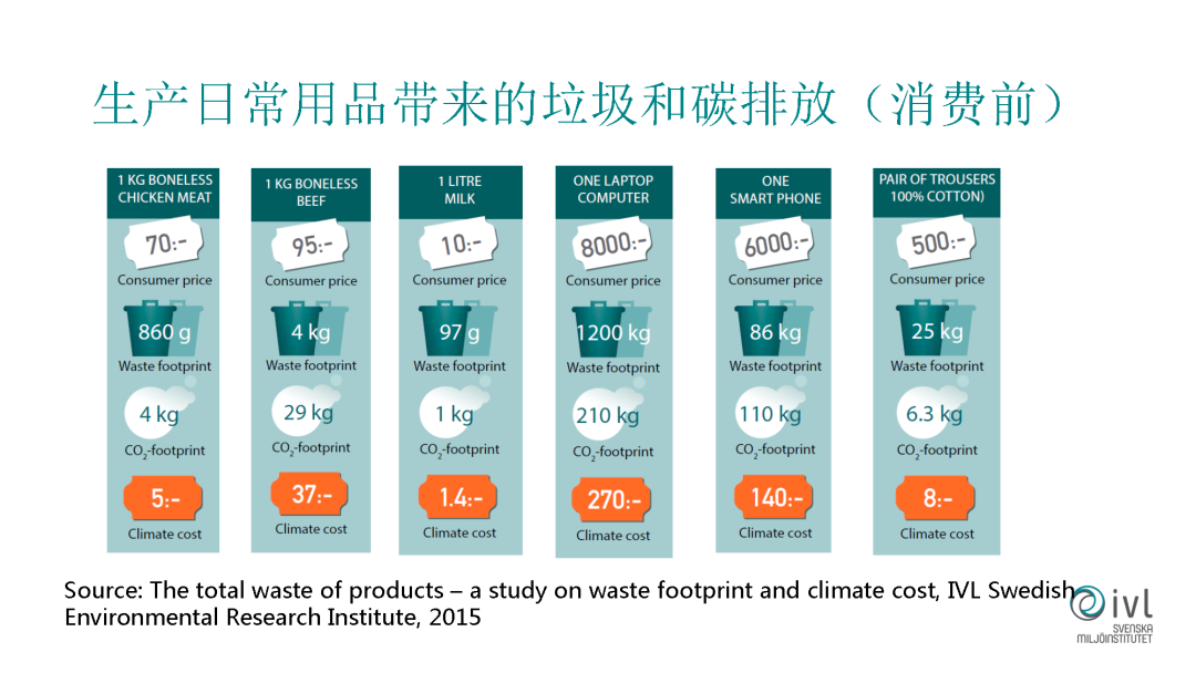 這個(gè)圖片想跟大家分享我們的一個(gè)研究報(bào)告,這是我們之前對(duì)我們?nèi)粘I钪兴褂玫囊恍┊a(chǎn)品的垃圾排放和碳排放的一些研究,我們選擇了一些代表性的日常消費(fèi)品。比如我們吃的肉還有牛奶、電腦、手機(jī)等等,我們舉一個(gè)例子來(lái)說(shuō),比如說(shuō)我們?cè)谫I一部手機(jī)之前,它所產(chǎn)生的垃圾,在它生產(chǎn)和加工之前的垃圾就已經(jīng)有86公斤。這個(gè)量是非常大,它所帶來(lái)的碳排放已經(jīng)是110公斤,這也是非常大的。